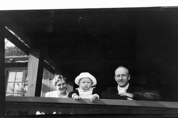 Hilda og Rolf Sundt sr.med sin sønn på verandaen, Villa Knyggen. Fotografert 1918-1919.
