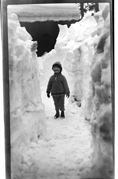 Julius Sundt står ute med masse snø rundt seg, Ville Knyggen. Fotografert 1919-1920.