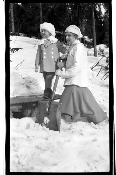 Hilda Sundt med sin sønn Julius ved en benk med spade i snøen, Villa Knyggen. Fotografert 1918-1919.