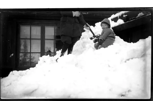 Julius Sundt sitter i snøen mens en mann måker snø, Villa Knyggen. Fotografert 1919.
