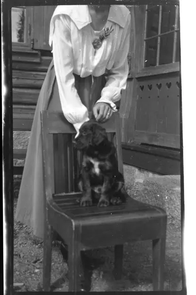 Hunden Rolla sitter på en stol, Hilda Sundt uten hode, Villa Knyggen. Fotografert 1918-1919.