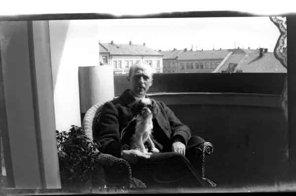 Rolf Sundt sr. sitter på verandaen med en hund i fanget, Frederiks Stangs gate. Fotografert 1918.