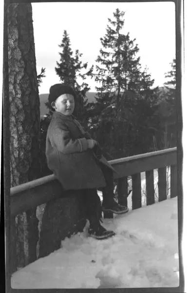 Julius Sundt sitter på gjerdet, Villa Knyggen. Fotografert 1920.