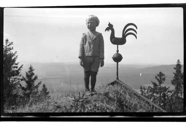 Julius Sundt står ved siden av en værhane på taket, Villa Knyggen. Fotografert 1920.