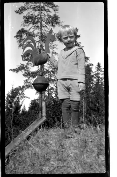 Julius Sundt står ved siden av en værhane på taket, Villa Knyggen. Fotografert 1920.