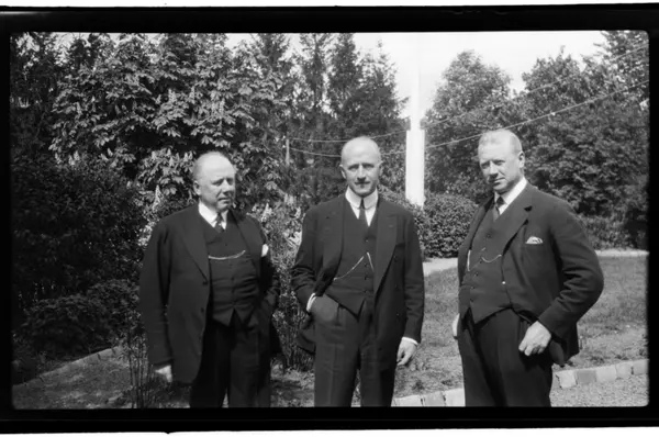Brødrene Lauritz Sundt, Rolf og Finn Sundt feirer Rolfs femtiårsdag hos Lauritz på Bestum 7. juni 1931.