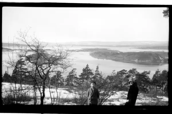 Hilda Sundt står sammen med sin sønn Rolf jr. i snø på Ekeberg med utsikt over bla. Hovedøya i Oslofjorden. Fotografert 1930.