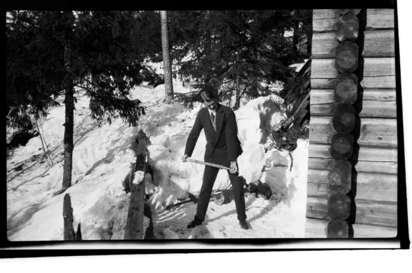 Edouard Sundt fra England er på besøk hos sin fetter Rolf Sundt sr. på Villa Knyggen og hjelper til med å måke snø. Fotografert 8. mars 1920.