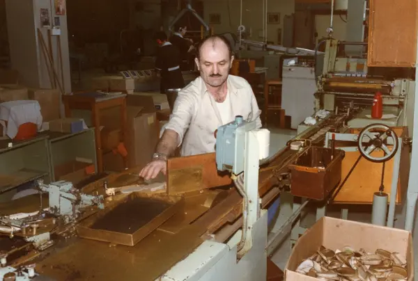 Siste dag for produksjon av ovale pappesker for snus på (antatt) Tiedemanns eskefabrikk på Bergensgate.