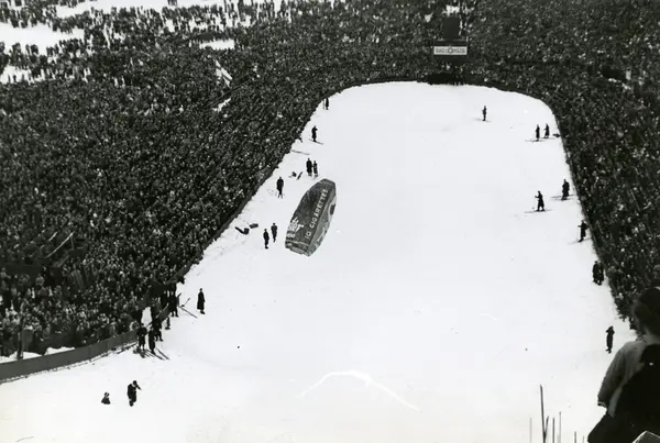 Ballong med reklame for Blue Master sigaretter ved hoppkonkurranse i Holmenkollen.