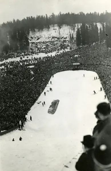 Ballong med reklame for Blue Master sigaretter ved hoppkonkurranse i Holmenkollen.