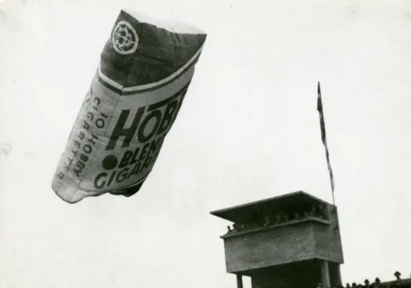 Ballong med reklame for Hobby sigaretter ved hoppkonkurranse i Holmenkollen.