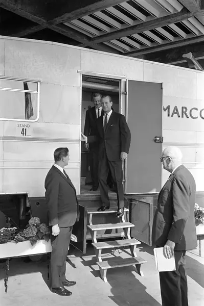 Prins Philip, Hertugen av Edinburgh, besøker den britiske utstilling i 1965 i Oslo. Prinsen kommer ut av stand nr. 41 på utstillingen.
