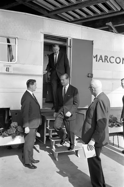 Prins Philip, Hertugen av Edinburgh, besøker den britiske utstilling i 1965 i Oslo. Prinsen, i midten, kommer ut av stand nr. 41 på utstillingen.