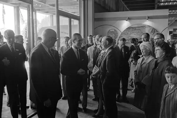 Prins Philip, Hertugen av Edinburgh, besøker den britiske utstilling i 1965 i Oslo. Prinsen smilende midt i bildet.