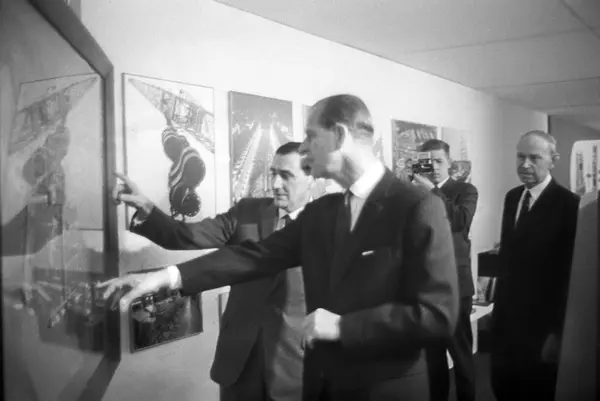 Prins Philip, Hertugen av Edinburgh, besøker utstilling på Sjølyst i mai 1966 i Oslo. Her blir prinsen vist rundt. Prinsen midt i bildet.