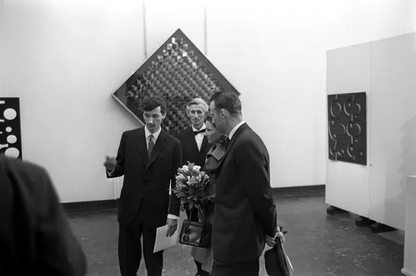 Kronprins Harald og kronprinsesse Sonja besøker utstilling i Kunstnernes Hus. Her blir de vist rundt blant diverse kunstverk av representanter for Kunstnernes Hus.