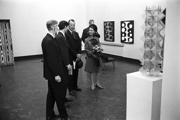 Kronprins Harald og kronprinsesse Sonja besøker utstilling i Kunstnernes Hus. Her blir de vist rundt blant diverse kunstverk av representanter for Kunstnernes Hus.