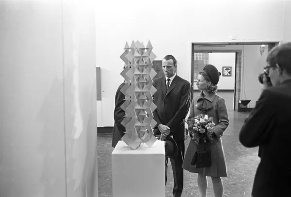 Kronprins Harald og kronprinsesse Sonja besøker utstilling i Kunstnernes Hus. Her blir de vist rundt blant diverse kunstverk av representanter for Kunstnernes Hus. Fotograf til høyre i bildet.