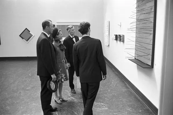 Kronprins Harald og kronprinsesse Sonja besøker utstilling i Kunstnernes Hus. Her blir de vist rundt blant diverse kunstverk av representanter for Kunstnernes Hus.