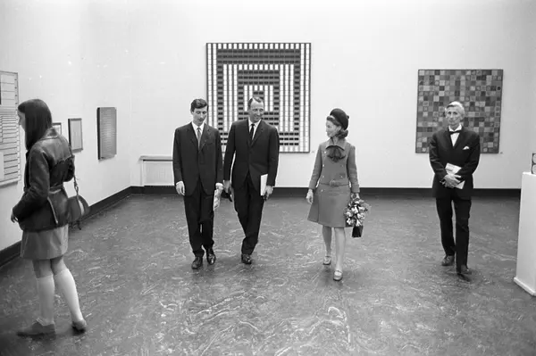 Kronprins Harald og kronprinsesse Sonja besøker utstilling i Kunstnernes Hus. Her blir de vist rundt blant diverse kunstverk av representanter for Kunstnernes Hus.