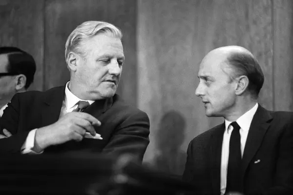 Til høyre, Kåre Willoch, Høyres formann. Her sammen med John Lyng også fra Høyre. Det er antatt at bildet ble tatt på Høyres landsmøte.