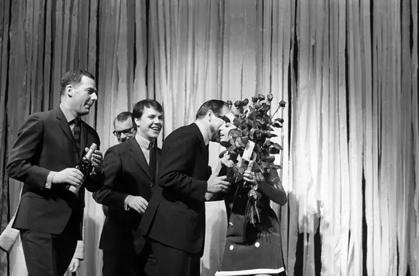 Bursdagsfeiring av Lill-Babs, Barbro Svensson, på Chat Noirs scene. Fem herrer ble fløyet inn til feiringen og her overrekkes blomster og Champagne til jubilanten. Til venstre står direktør Totto Johannessen.