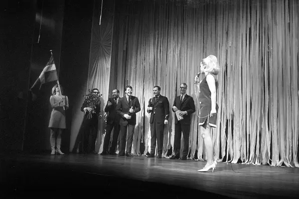 Bursdagsfeiring av Lill-Babs, Barbro Svensson, på Chat Noirs scene. Fem herrer ble fløyet inn til feiringen og her skal det overrekkes blomster og Champagne til jubilanten. Direktør Totto Johannessen nr. 3 fra høyre. Grynet Molvig ytterst til venstre.