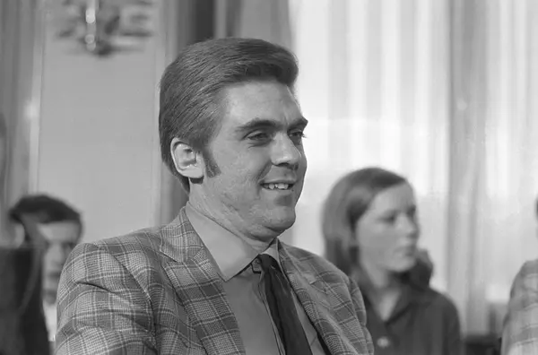 Buck Owens og hans band The Buckaroos gjester Oslo. Pressekonferanse på Hotel Continental. Her er steelgitaristen Jay Dee Maness.