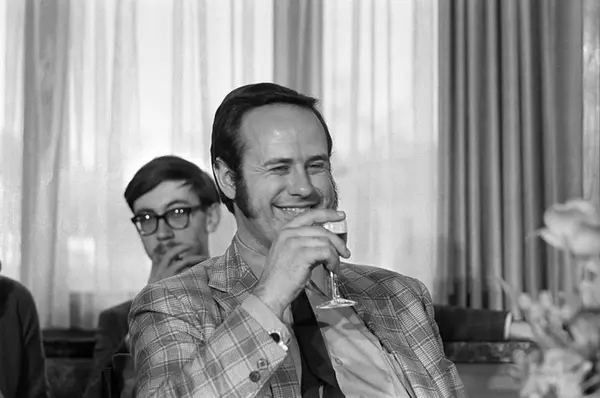 Buck Owens og hans band The Buckaroos gjester Oslo. Pressekonferanse på Hotel Continental. Her er gitaristen Don Rich.