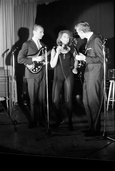 Dizzie Tunes skal på turné med revyen "Åh, så heldige vi er" sammen med Wenche Myhre og Ivar Medaas. Her er Wenche under generalprøven i Keysers gate i Oslo sammen med fra venstre Svein Helge Høgberg og Einar Idland.
