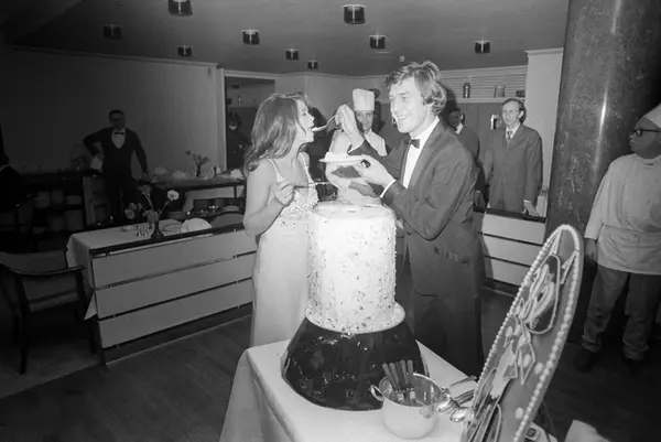 Ny revy på Chat Noir "Show før, jo heller" med Wenche Myhre og Dizzie Tunes. Her fra premierefesten. Her blir Wenche Myhre til venstre matet med kake av show-arrangør Jørg Fr. Ellertsen til høyre.