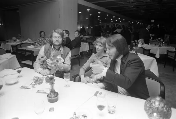Ny revy på Chat Noir "Show før, jo heller" med Wenche Myhre og Dizzie Tunes. Her fra premierefesten. Til venstre Øystein Sunde og tryllekunstner Tore Torell til høyre. Anne Elisenberg i midten.
