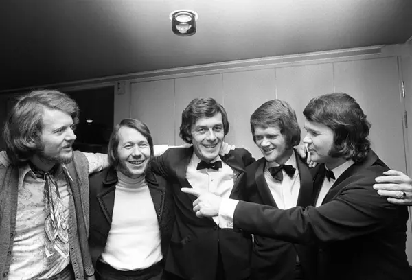 Ny revy på Chat Noir "Show før, jo heller" med Wenche Myhre og Dizzie Tunes. Her fra premierefesten. Fra venstre Øystein Sunde, Tore Torell, Jørg F. Ellertsen, Yngvar Numme og Finn Eriksen.