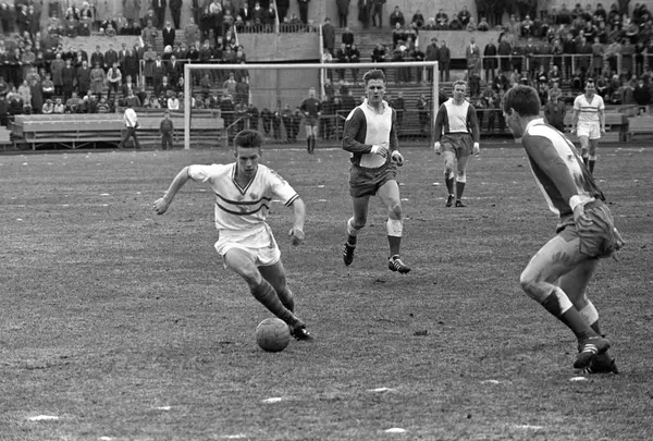 Fotballkamp Brann - Lyn på Ullevål stadion i Oslo. Roald "Kniksen" Jensen (Brann) til høyre og ellers ukjente spillere fra Lyn. Publikum på tribunen.