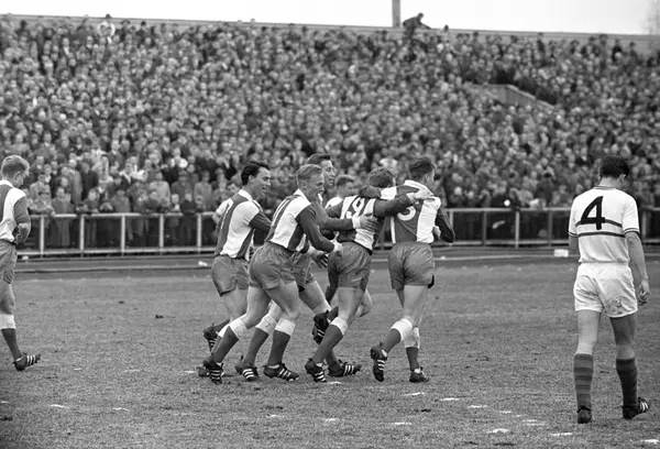 Fotballkamp Brann - Lyn på Ullevål stadion i Oslo. Ole Stavrum med antatt nr. 9 på ryggen har scoret Lyns første mål. Jan Eriksen (bakerst), Axel Berg, Kjell Saga og Tore Hansen gratulerer. Publikum på tribunen.