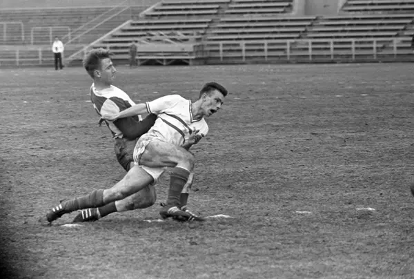 Fotballkamp Brann - Lyn på Ullevål stadion i Oslo. Foran Roald Kniksen Jensen (Brann) i duell med Tore Hansen (Lyn).