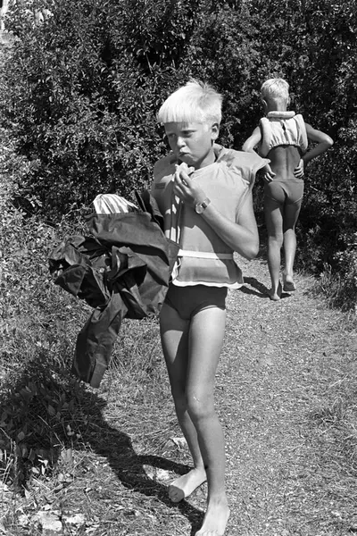 Erik Damman, reklamekonsulent fra Oslo, ferierer i båt med familien i Oslofjorden. De skal ro 10 - 12 mil i løpet av 8 - 10 dager, og går i land på små holmer som fjorden har mange av. Antatt Rein (10) og Are (8) på vei ned til båten før avreise fra Brønnøya.