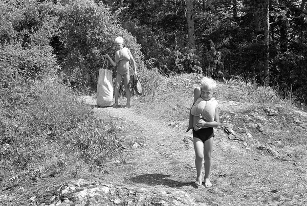 Erik Damman, reklamekonsulent fra Oslo, ferierer i båt med familien i Oslofjorden. De skal ro 10 - 12 mil i løpet av 8 - 10 dager, og går i land på små holmer som fjorden har mange av. To av barna, antatt Rein (10) bak og Are (8) på vei ned til båten før avgang fra Brønnøya.