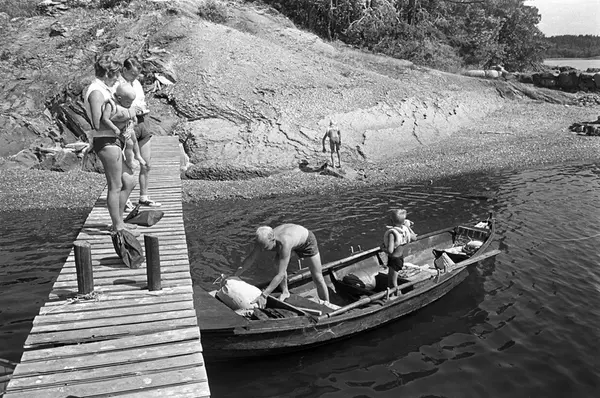 Erik Damman, reklamekonsulent fra Oslo, ferierer i båt med familien i Oslofjorden. De skal ro 10 - 12 mil i løpet av 8 - 10 dager, og går i land på små holmer som fjorden har mange av. Like før avreise fra Brønnøya. Ragnhild Damman på brygga med Jaran (1,5). I båten Erik Damman og Brede (5).