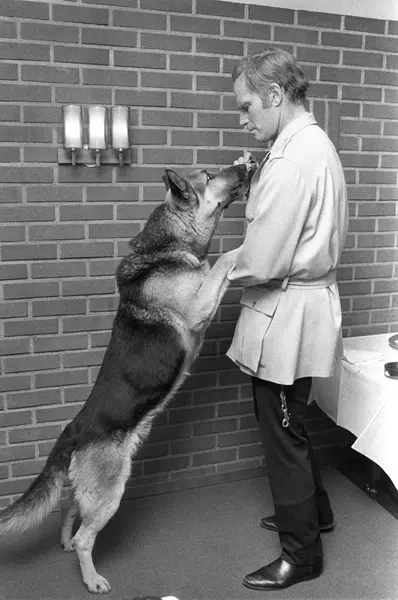 Den amerikanske skuespilleren Charlton Heston har kommet til Norge i forbindelse med opptak til filmen "Når villdyret våkner". Her er han sammen med en schæferhund på pressekonferansen i Oslo.