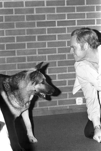 Den amerikanske skuespilleren Charlton Heston har kommet til Norge i forbindelse med opptak til filmen "Når villdyret våkner". Her er han sammen med en schæferhund på pressekonferansen i Oslo.