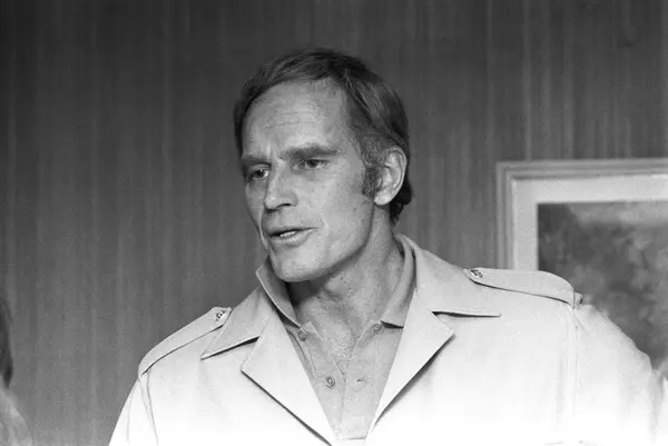 Den amerikanske skuespilleren Charlton Heston har kommet til Norge i forbindelse med opptak til filmen "Når villdyret våkner". Her fra pressekonferansen i Oslo.