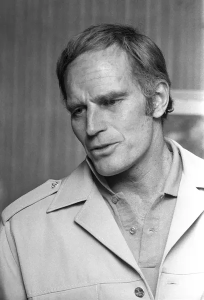 Den amerikanske skuespilleren Charlton Heston har kommet til Norge i forbindelse med opptak til filmen "Når villdyret våkner". Her fra pressekonferansen i Oslo.