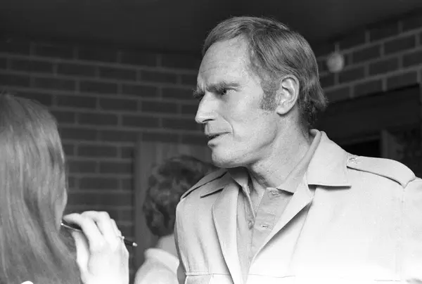 Den amerikanske skuespilleren Charlton Heston har kommet til Norge i forbindelse med opptak til filmen "Når villdyret våkner". Her fra pressekonferansen hvor han blir intervjuet av en journalist. .
