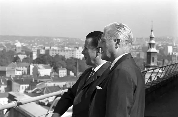 Den tyske forbundskansleren Ludwig Erhard er på offisielt besøk i Norge. Her er utenriksminister John Lyng til høyre sammen med tysklands utenriksminister Gerhard Schrõder på terrassen utenfor statsministerens kontor i Regjeringsbygget.