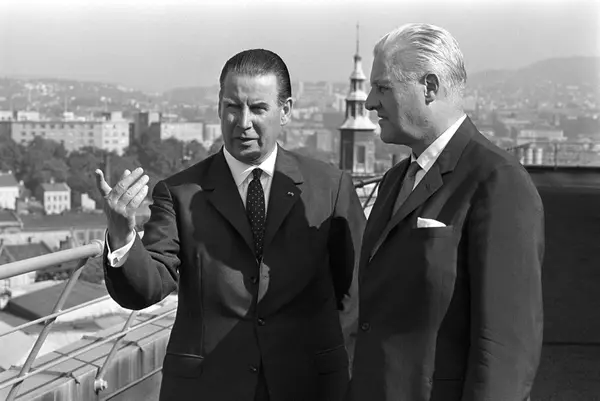 Den tyske forbundskansleren Ludwig Erhard er på offisielt besøk i Norge. Her er utenriksminister John Lyng til høyre sammen med tysklands utenriksminister Gerhard Schrõder på terrassen utenfor statsministerens kontor i Regjeringsbygget.