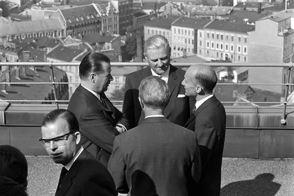 Den tyske forbundskansleren Ludwig Erhard er på offisielt besøk i Norge. Her er utenriksminister John Lyng (i midten) sammen med Kåre Willoch til høyre og tysklands utenriksminister Gerhard Schrõder til venstre på terrassen utenfor statsministerens kontor i Regjeringsbygget.