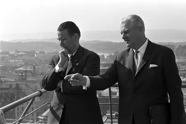 Den tyske forbundskansleren Ludwig Erhard er på offisielt besøk i Norge. Her er utenriksminister John Lyng til høyre sammen med tysklands utenriksminister Gerhard Schrõder på terrassen utenfor statsministerens kontor i Regjeringsbygget.