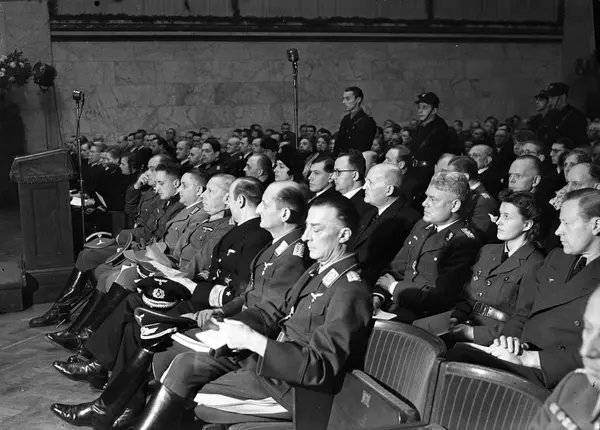 Begravelse til komponist Christian Sinding i Universistetets Aula i Oslo i desember 1941. Nazi-topper på rekke og rad. Politiminister Jonas Lie sitter på andre rad, nr. tre fra høyre.